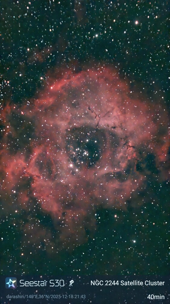 天体望遠鏡:seestar フィルター:on 撮影場所:茨城県かすみがうら市 画像編集ソフト:AIデノイズ+Googleフォト 撮影時間:40分< 発見・気づきなど>ばら星雲は大きくて、S30でも隅・・・▶