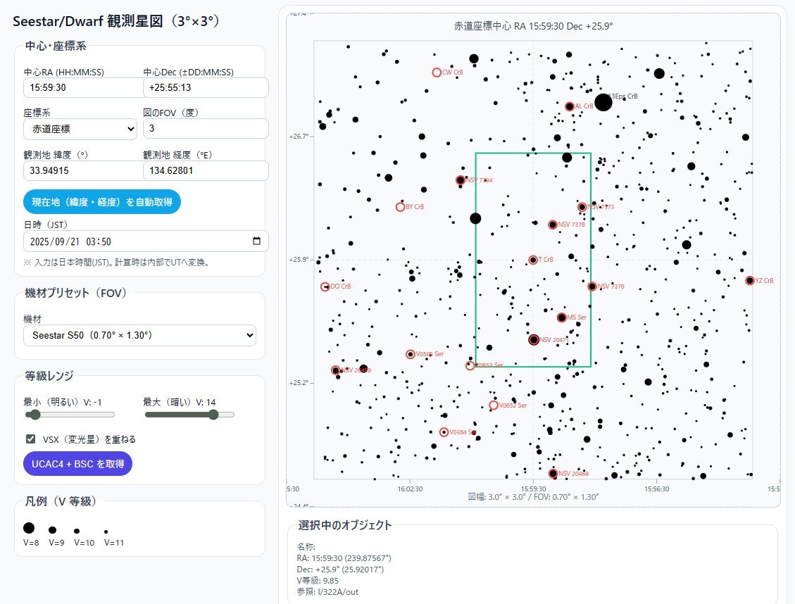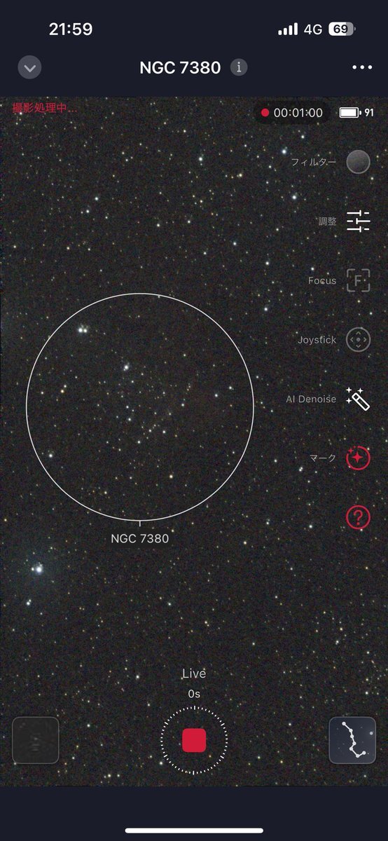 ![]() (千葉県 since 2022) ![]() ■天体望遠鏡:seestar ■フィルター:on ■撮影場所:千葉県・南房総市 ■画像編集ソフト:AIデノイズ+LrC ■撮影時間:21分 <■発見・気づきなど> 銀河星雲図鑑の最後の天体として、雷神の兜星雲を撮影した。途中で薄明が始まってしまい、エラーが増えてしまったので撮影時間は21分で終了、しかし独特の緑色の天体がスマホ画面に現れて、素直に嬉しかった。次のステップはEQモード撮影とレモン水星か。 2025年09月23(火)