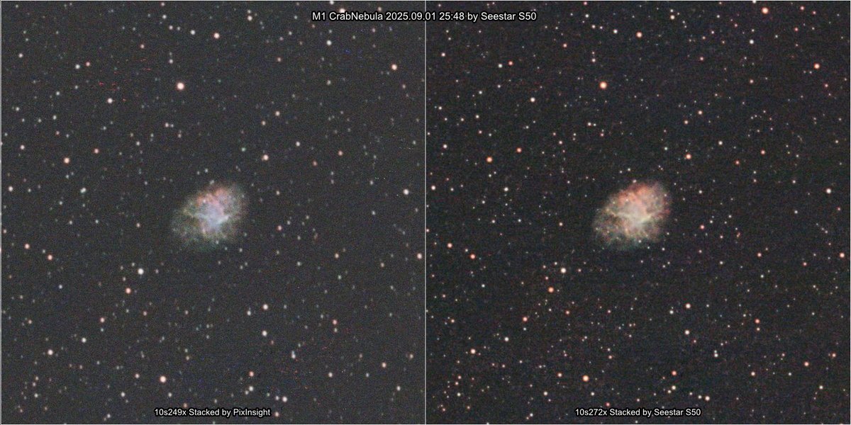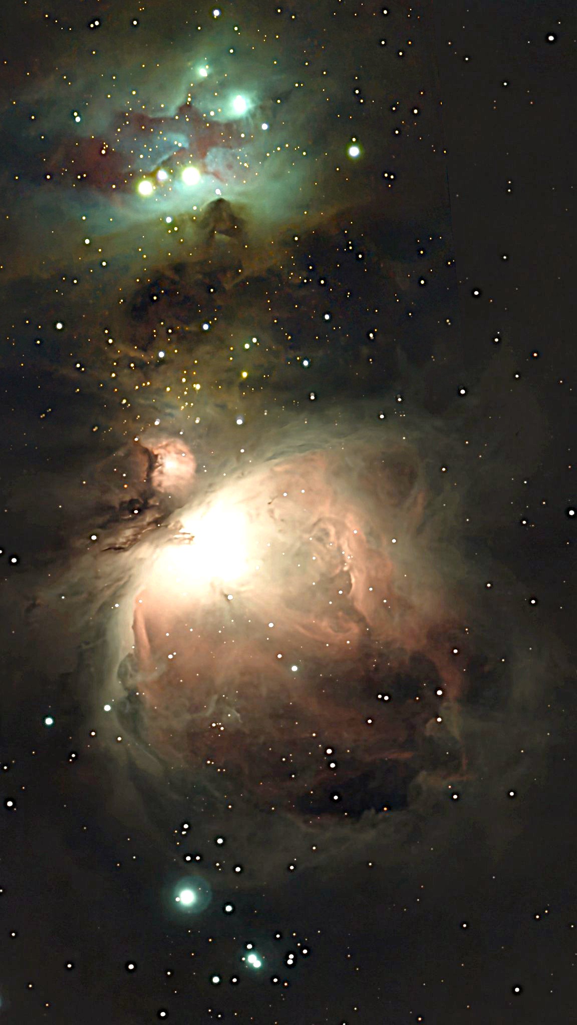 いなりん▶(愛知県 since 2023) 事前に断っておきますが、天体写真の実像としての価値は皆無で、かなり邪道である事を前提で。 赤道儀モードで撮影している限り、天の北方向が必ず同じになります。 その為、手動でのモザイク合成は、かなり楽になります。 異なる画角というのは、フレーミング数倍での撮影結果の事。 1.2倍で撮影したM42と、等倍で撮影したNGC1973の2枚の写真を合成する場合、NGC1973を縮小する必要があります。 ![]() ![]() この場合、89%縮小から始め、小数点以下で調整を行いました。 つづき▼▲ 2025年10月19(日)