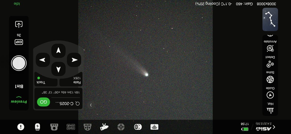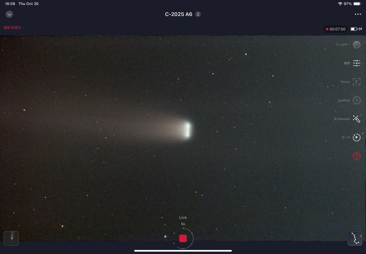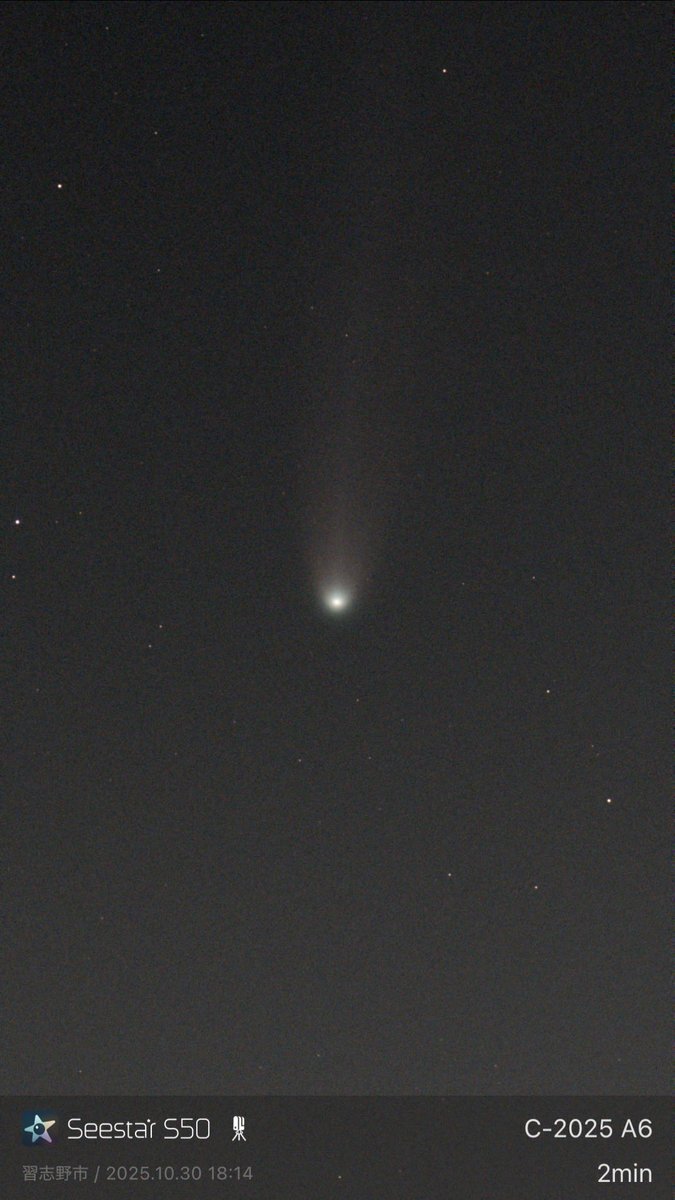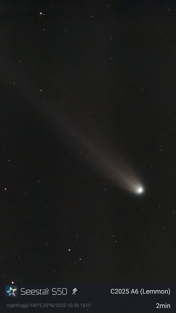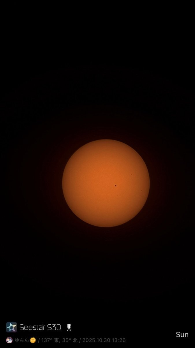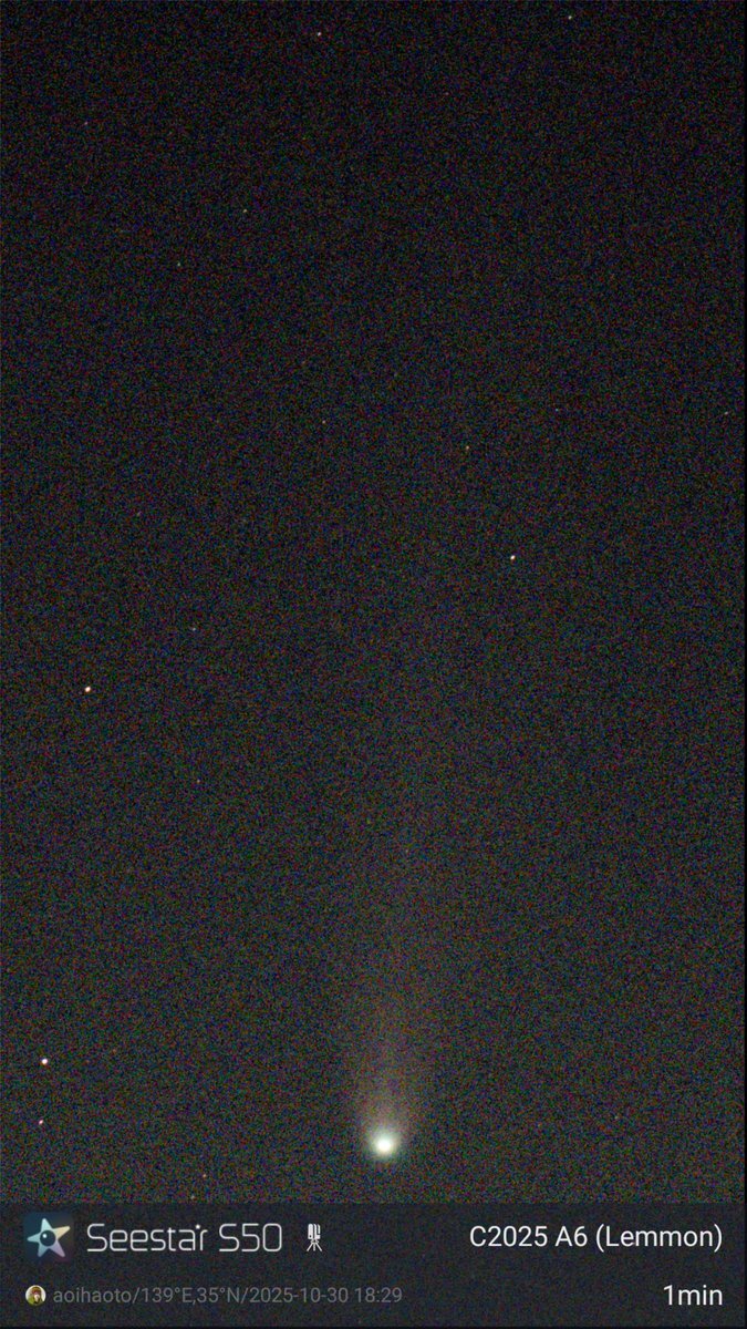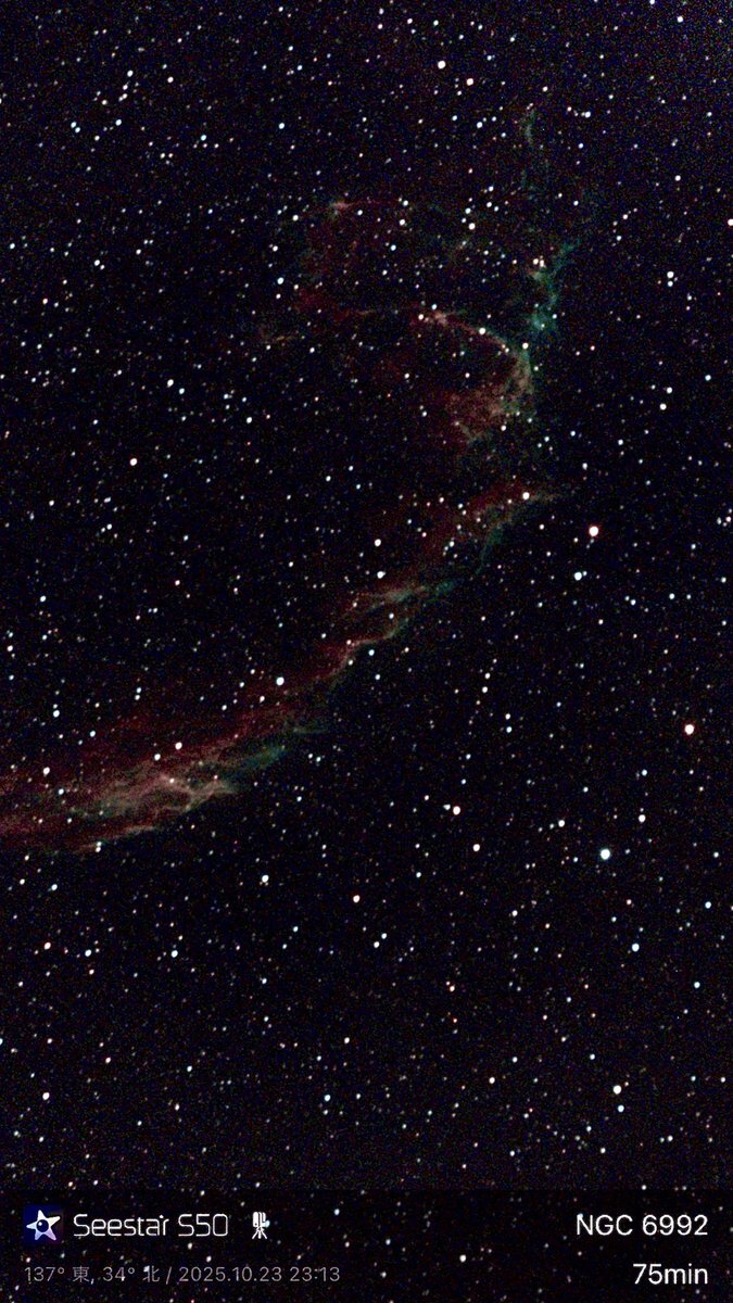だらしん▶(新潟県 since 2025) ![]() ■天体望遠鏡:seestar ■フィルター:on ■撮影場所:茨城県行方市 ■画像編集ソフト:AIデノイズ+Googleフォト ■撮影時間:61分 <■発見・気づきなど> 晴れ予報を信じて遠征してみたのですが、日が暮れたらみるみる雲が増えてきて、雲の切れ間から星空がわずかに垣間見える程度になってしまいました。 隣で準備していたアンドロメダ狙いのセット(FMA180+ASI585MC)は、プレートソルブ出来なくなって早々に撮影を断念したのですが、先に撮影開始したS30は雲の切れ間からの星雲の光を拾い続けて60分も露光してくれました。 Seestarのおかげで何も撮れずに帰るという最悪の事態は回避できて、感謝です。 2025年10月23(木)