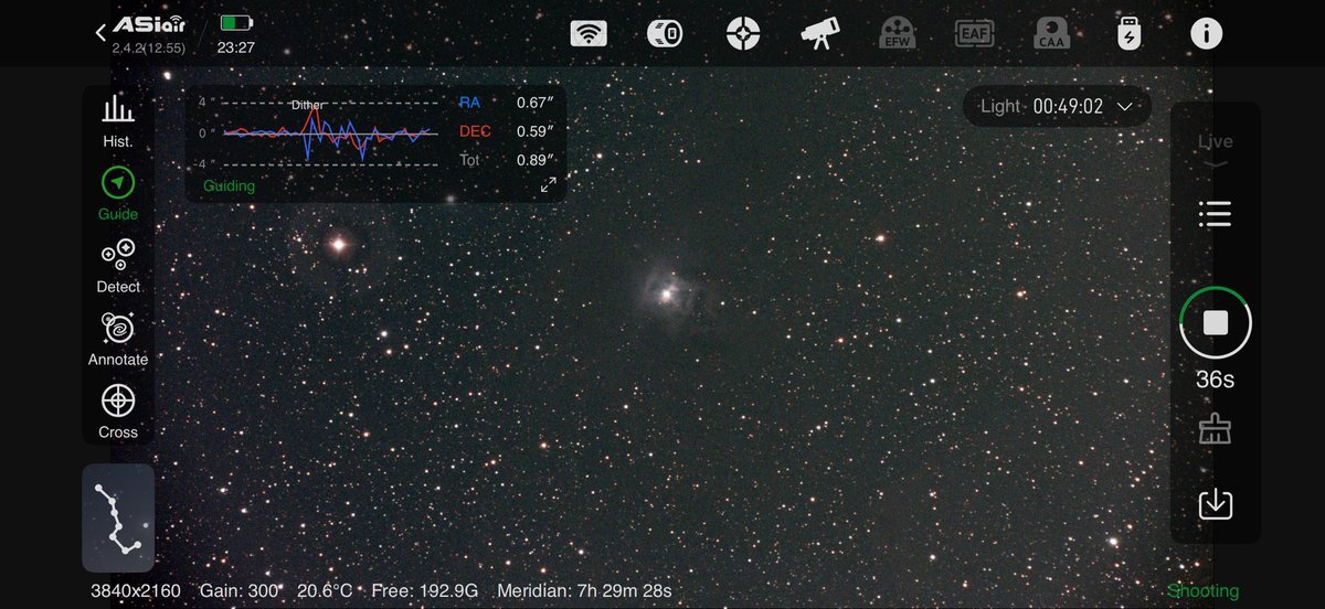 前日の21時。高度角28度 stacしたものの、そばのアパートの夜間灯が映り込むほどカブリがひどく中止。(星雲中心のみ点光源)未明に再トライ。高度角58度 南中直前。2分ほどで渦状が見えてきたので、薄・・・▶