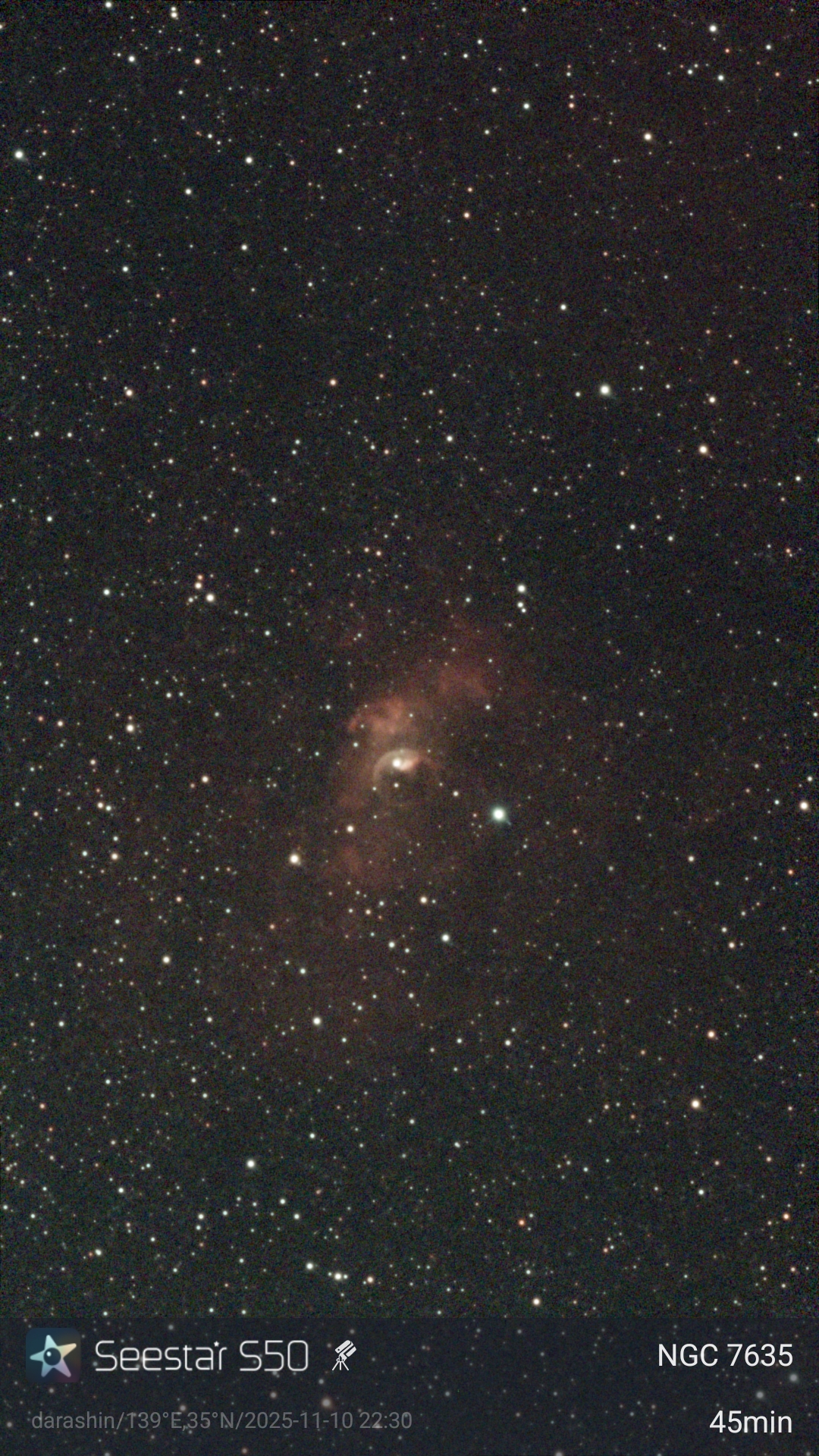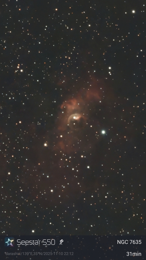DSOをSeestarで観望はじめて1週間ぐらい昨年10月の撮影。バブルが写ったと喜びました。左下のNGC7654と一緒にとってます。