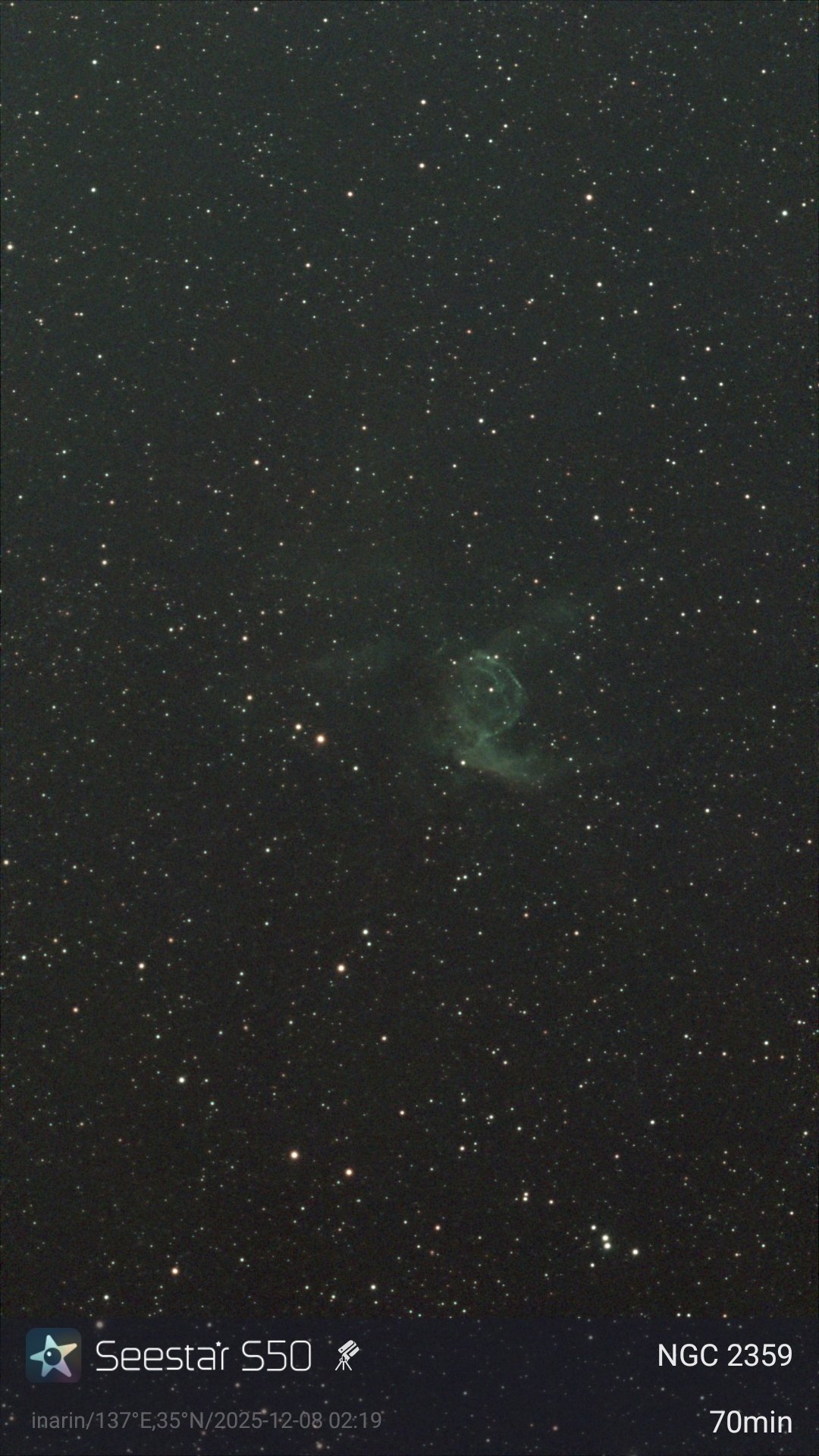 銀河星雲図鑑の最後の天体として、雷神の兜星雲を撮影した。途中で薄明が始まってしまい、エラーが増えてしまったので撮影時間は21分で終了、しかし独特の緑色の天体がスマホ画面に現れて、素直に嬉しかった。次のステップはEQモード撮影とレモン水星か。
