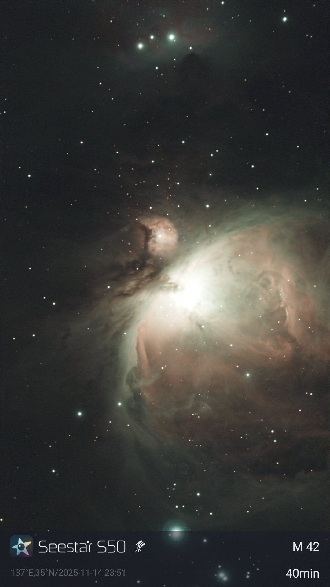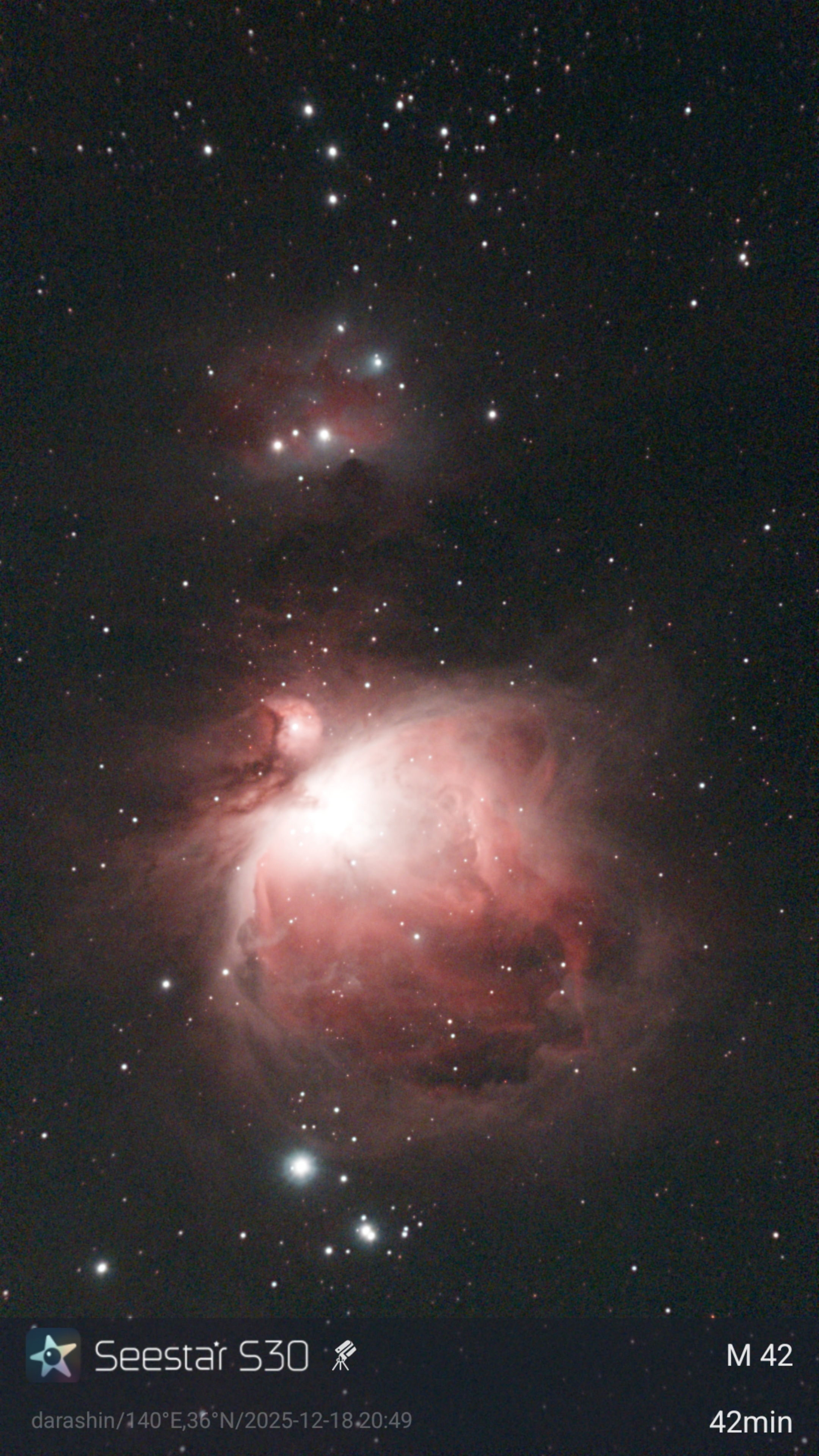 S30の画角だと、オリオン大星雲とマンニングマン星雲が綺麗に収まります。