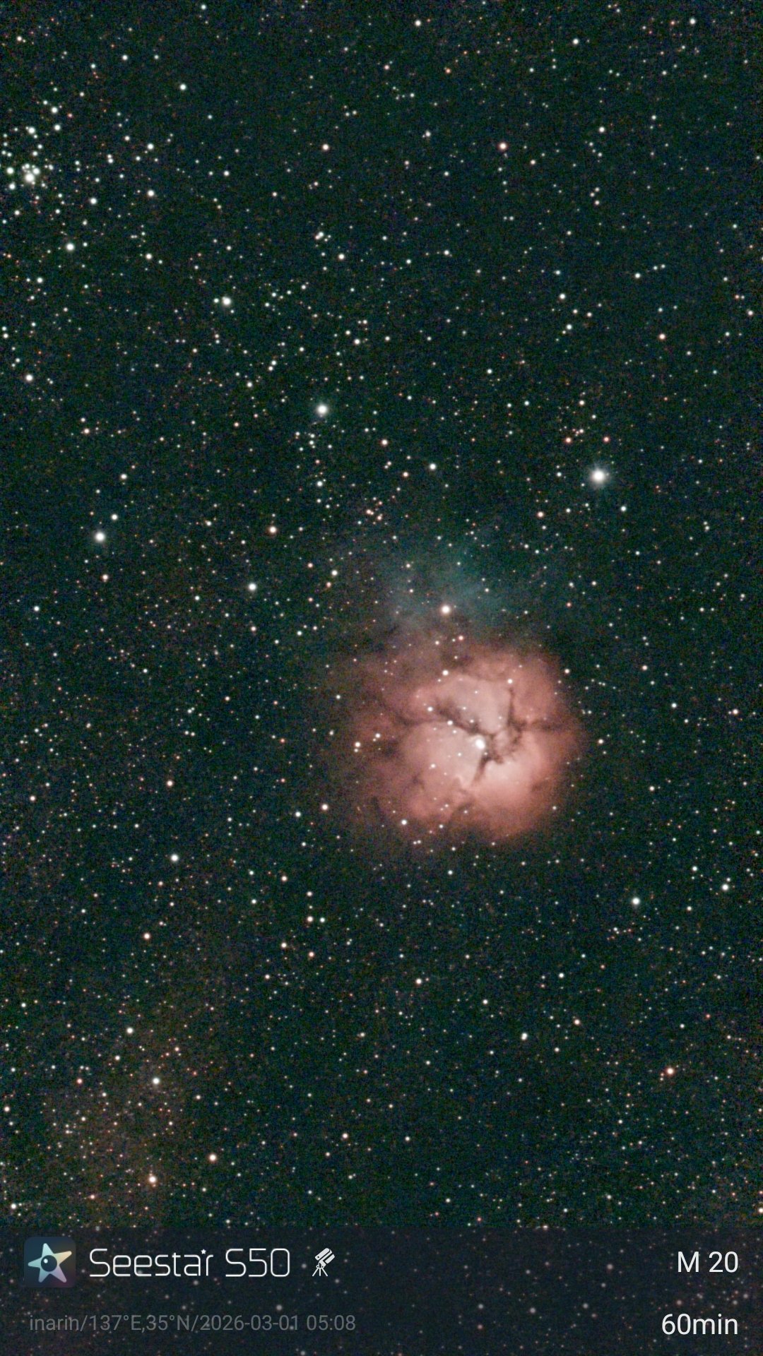 S30のセンサーは赤への感度が高いので、散光星雲はとても鮮やかに写りますね。Sirilでいじくりまわすよりも撮って出しの方が綺麗でした。